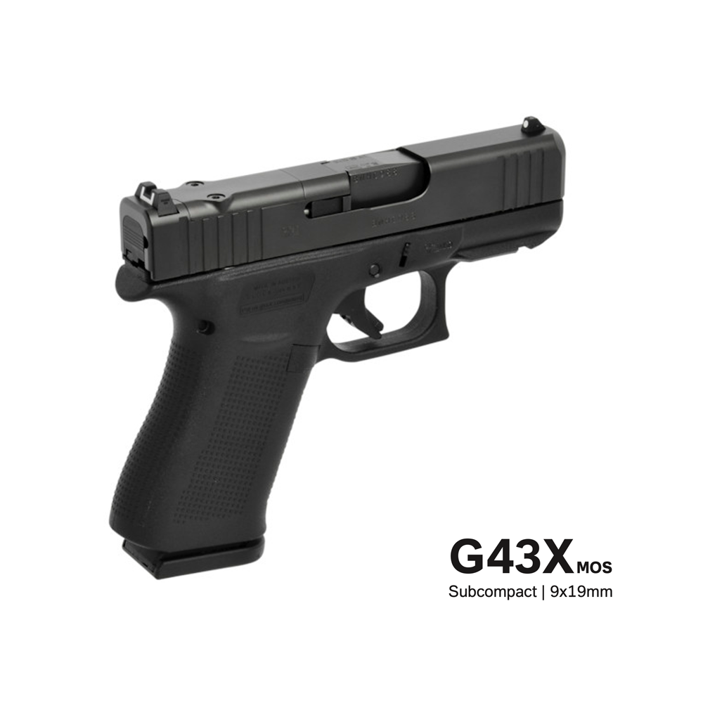 The G43X MOS has a short subcompact barrel length and a comfortably balanced, versatile compact-size grip with a minimal profile. It incorporates elements of the Slimline series such as the short trigger distance, a frame with a built-in beavertail as seen on the G43 and the G42, a reversible magazine catch. This model has the incredibly accurate, match-grade GLOCK Marksman Barrel (GMB) of the Gen5 series. The G43X MOS also features precision-milled front serrations.